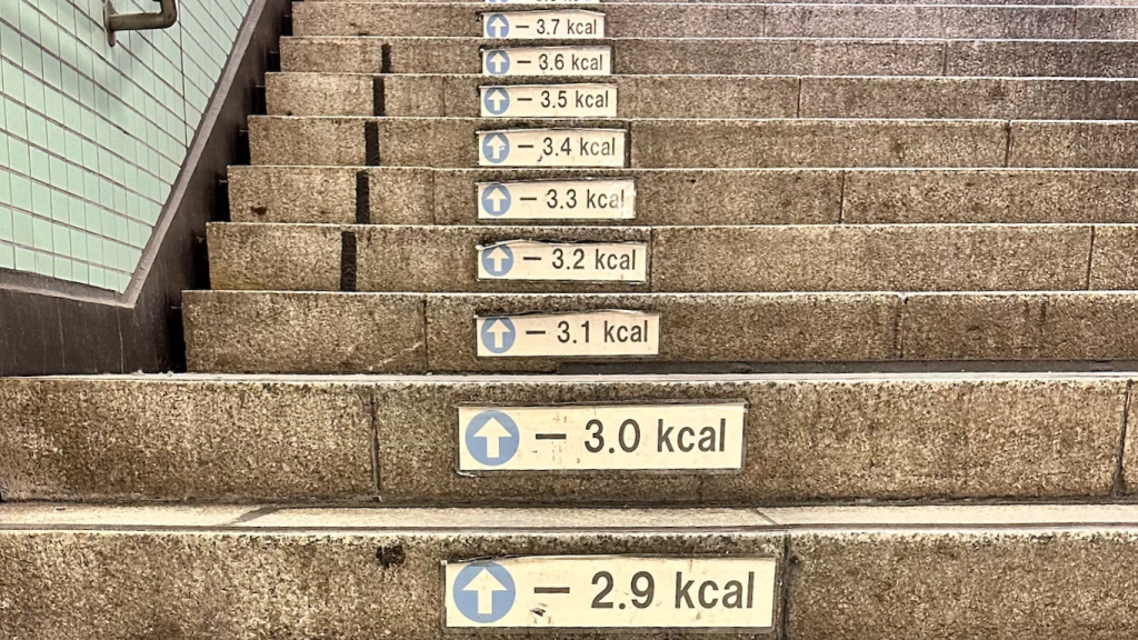 - ボクが東京で定宿にしている五反田駅では、地上への階段に「1段ごとの消費カロリー」が表示されており、つい挑戦したくなる仕掛けになっています。